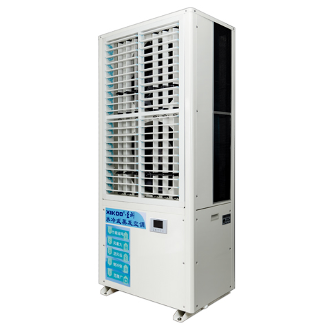 首先由外機采用濕簾蒸發式冷凝的技術來給循環水降溫,水溫降至常溫后流經內機的熱交換系統(此時壓縮機已運作,已將冷媒壓縮成高溫高壓狀態)從而帶走大部分高溫冷媒的熱量而形成常溫冷媒,常溫冷媒再經過節流閥后變成低溫低壓的冷媒,輸送至內機上半部分的蒸發器而吹出冷風;