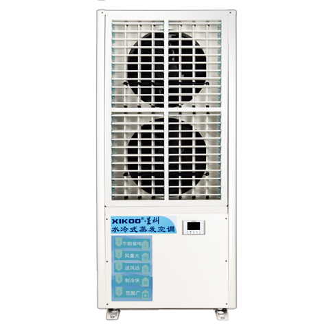 首先由外機采用濕簾蒸發(fā)式冷凝的技術來給循環(huán)水降溫,水溫降至常溫后流經內機的熱交換系統(tǒng)(此時壓縮機已運作,已將冷媒壓縮成高溫高壓狀態(tài))從而帶走大部分高溫冷媒的熱量而形成常溫冷媒,常溫冷媒再經過節(jié)流閥后變成低溫低壓的冷媒,輸送至內機上半部分的蒸發(fā)器而吹出冷風;